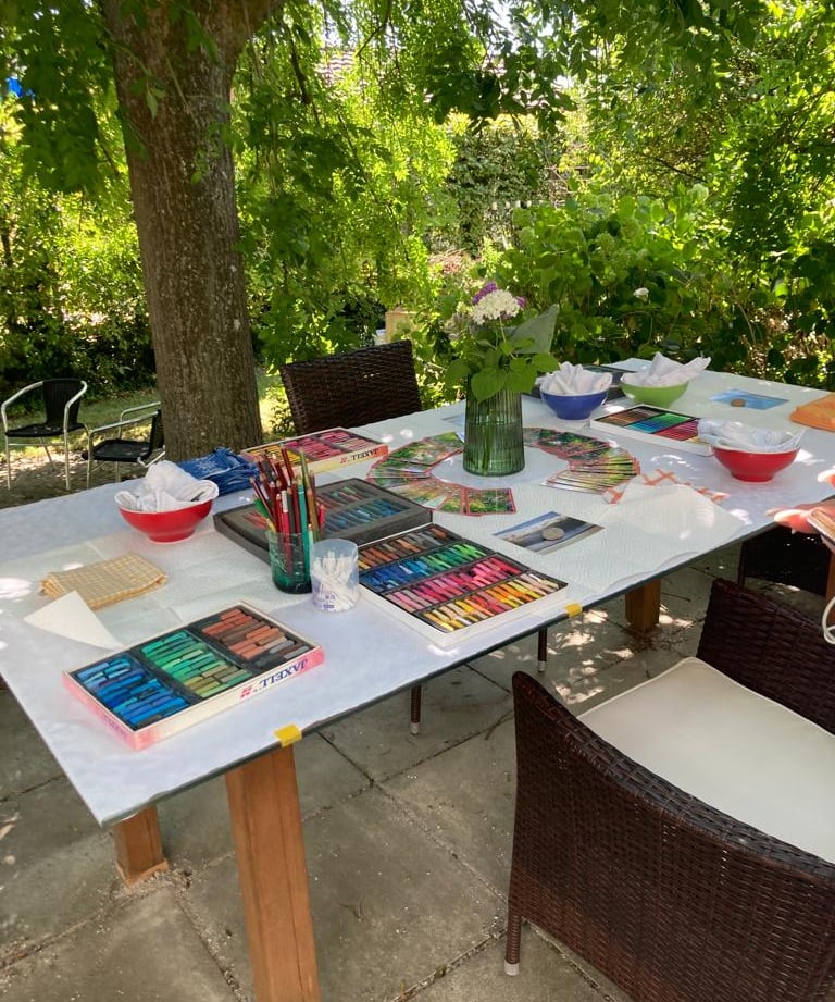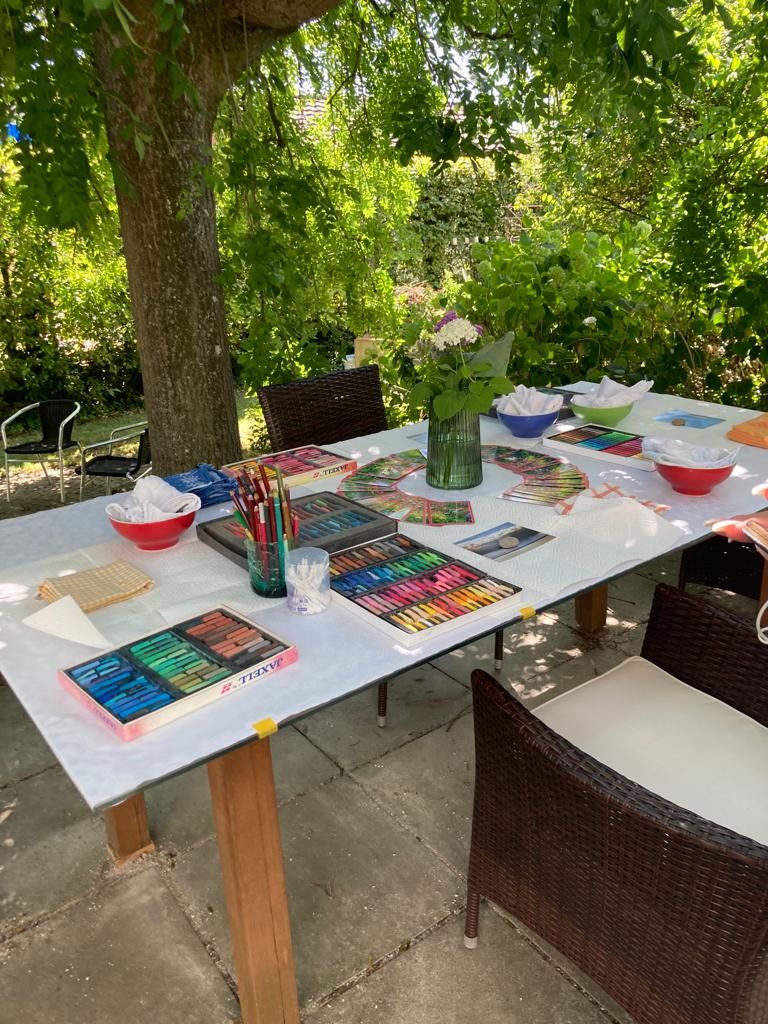 Im Sommer öffnet sich mein Malatelier nach draussen. Unter der einladenden Krone des alten Eschebaumes, eingehüllt in Grün, entsteht eine friedliche Wohlfühloase. Hier im Herzen des Gartens wird die Seele berührt und die Natur wird Teil des kreativen Prozesses. Diese Atmosphäre ist etwas ganz Besonderes. Ein achtsamer Raum unter freiem Himmel, getragen von der Schönheit des Augenblicks.